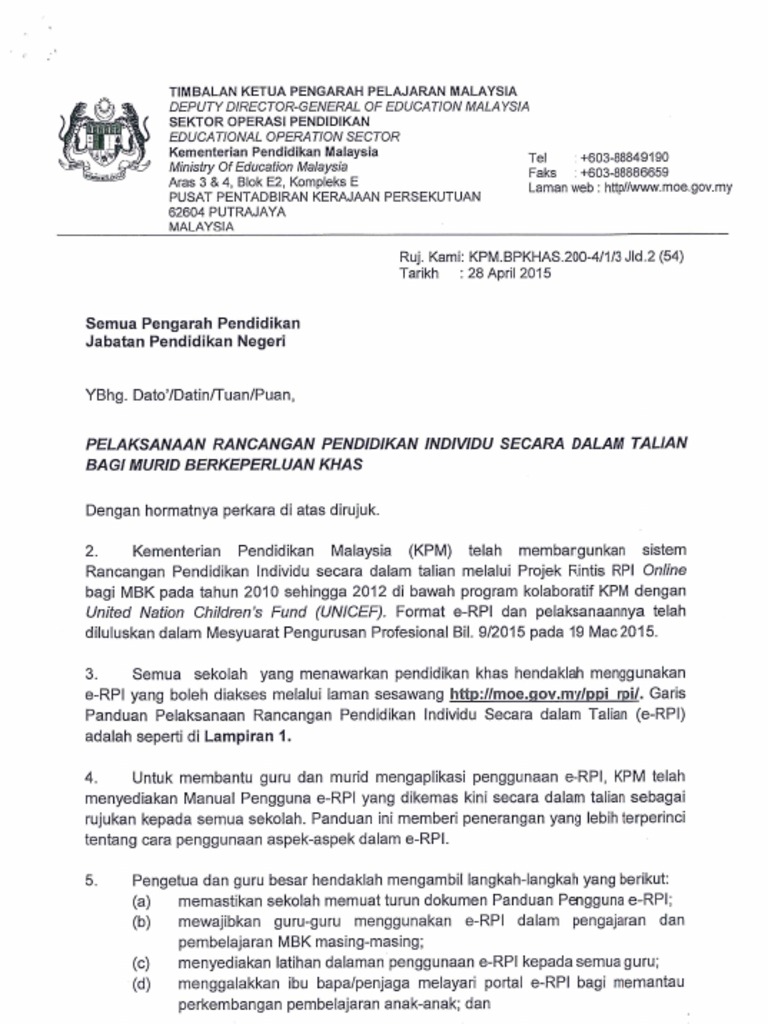 Guru diminta melaksanakan e-RPI dan membuat salinan menggunakan format manual. Makluman Format RPI Secara Manual Program Pendidikan Khas. Berita Sumber Pendidikan Khas.
